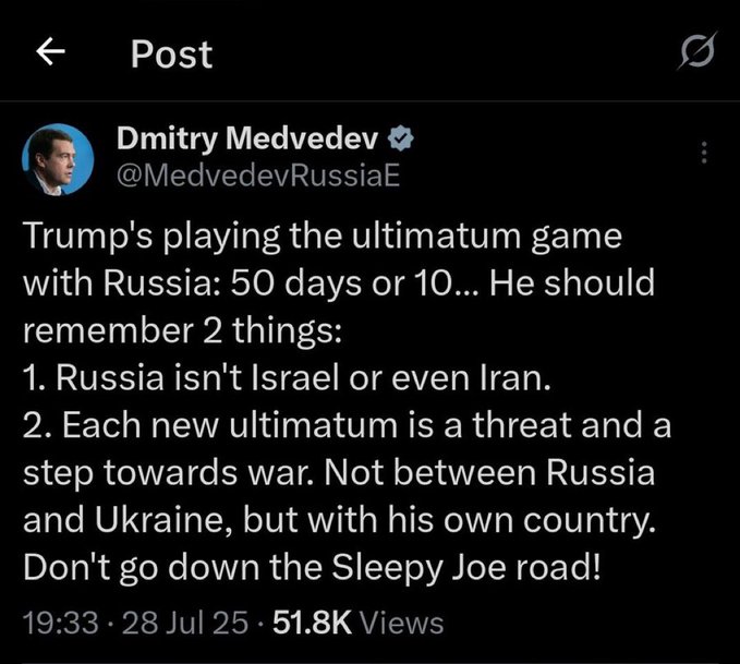 Medvedev’s remarks come amid growing concerns over escalating rhetoric and diplomatic strains between Russia and the United States. He emphasized that each new ultimatums issued by Trump are “a step towards war,” warning that such aggressive posturing undermines decades of fragile international stability. The comments reflect Moscow’s increasingly assertive stance on what it perceives as provocative actions by the U.S., amid broader geopolitical tensions.