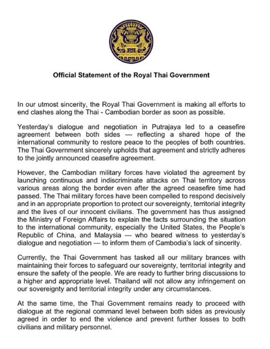 Thailand has issued a formal statement condemning Cambodia’s recent attack on Thai territory, marking a significant escalation in the ongoing border tensions between the two nations. The Thai government described Cambodia’s actions as a breach of the ceasefire agreements that have largely maintained relative calm along their shared border over the past months. Thailand’s Foreign Ministry expressed disappointment and stated that the attack undermines efforts to resolve disputes peacefully.