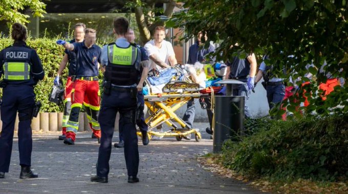 In Essen today, police officers shot a man following an attack at a local school. The incident began when an 18-year-old student from Kosovo stabbed a teacher in the stomach before fleeing the scene.